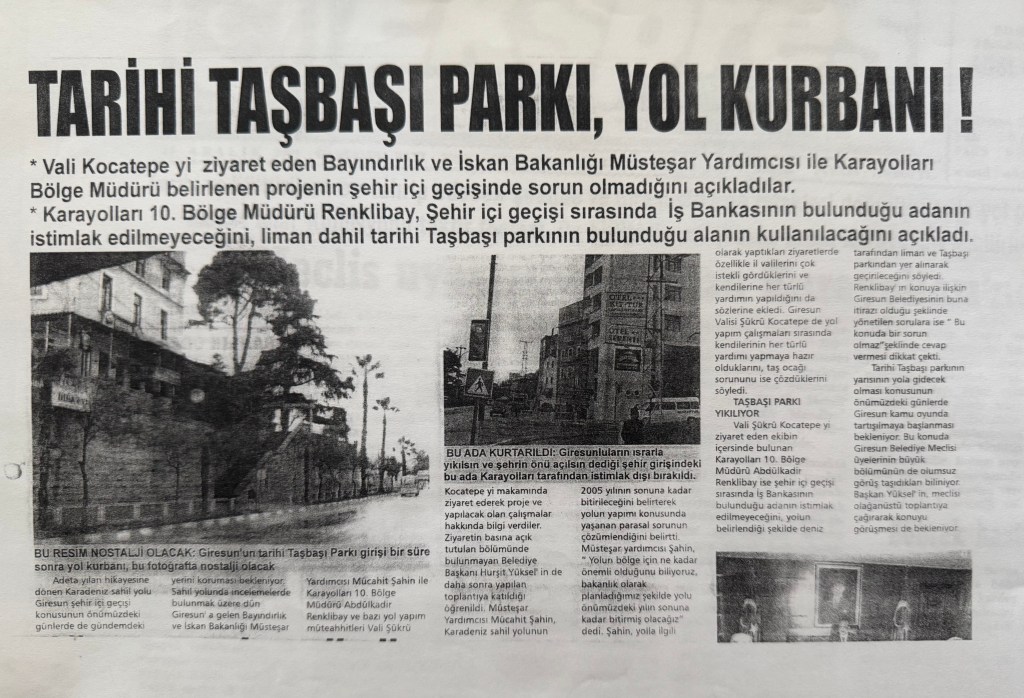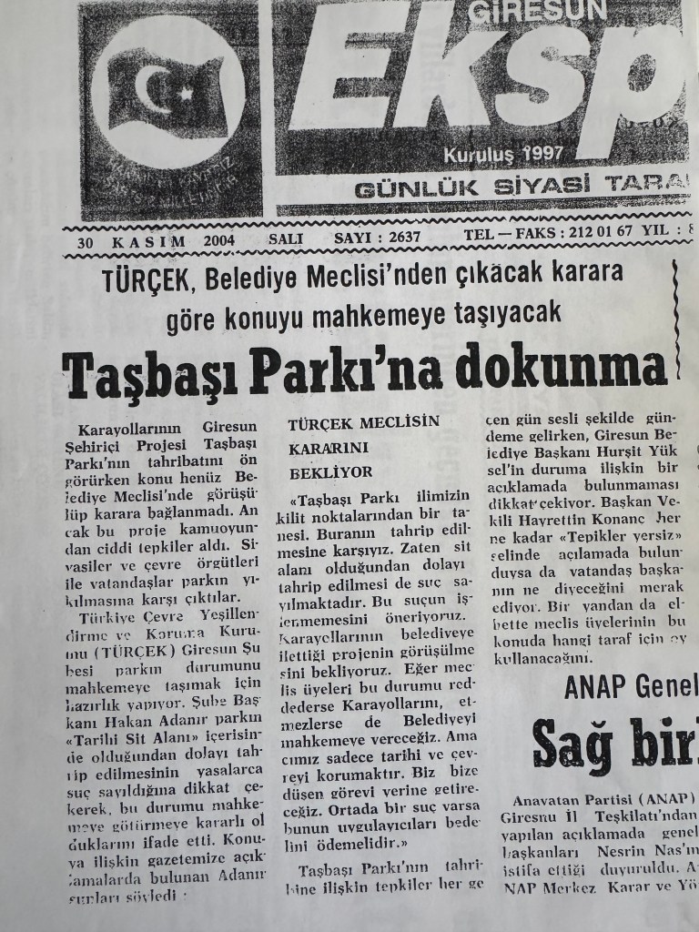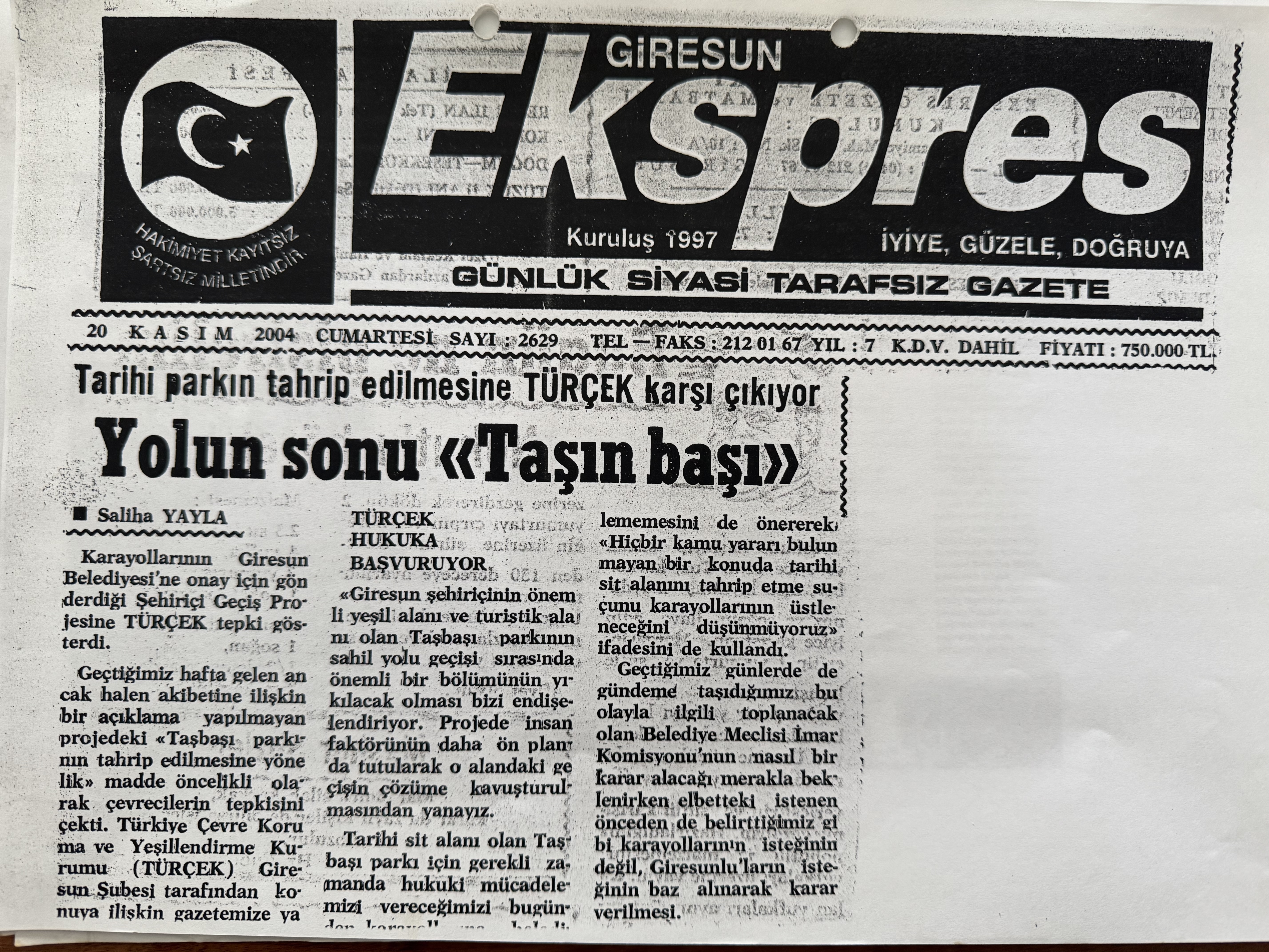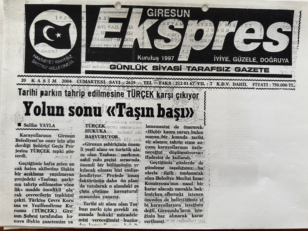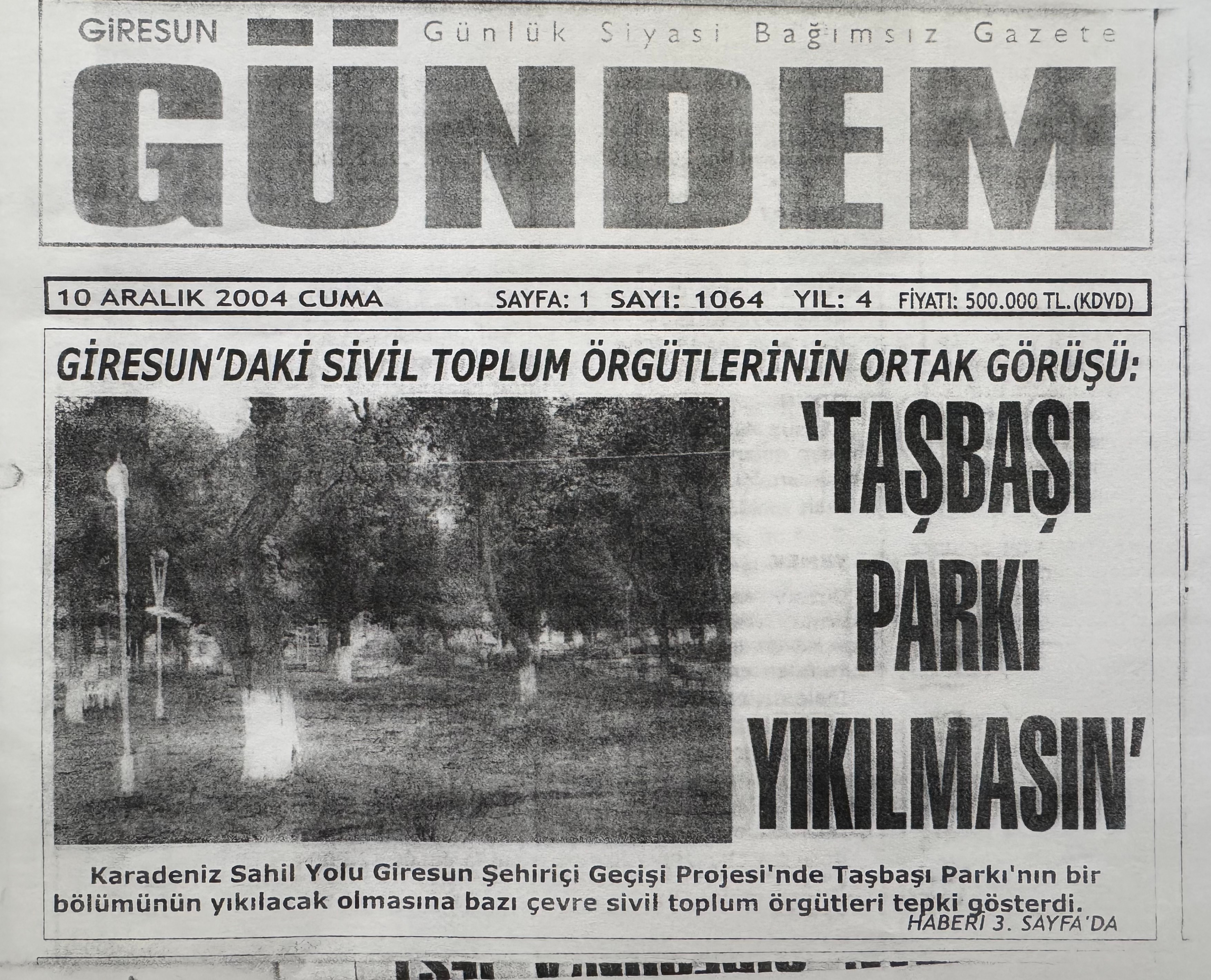2004 yılıydı. “Karadeniz sahil yolu iyileştirme projesi” “Karadeniz Duble Yolu”na yeni dönüştürülmüştü. Yol inşaatına karşı doğal alanlardaki mücadelemizin sonlarına gelmekteydik. Bazı koyları ve kumsalları kurtarmıştık. Ama bir çok koyu ve kumsalı da kurtaramamıştık. Yol inşaatı Giresun şehir içine yaklaştıkça artık Giresun halkı da mücadelemize daha çok kulak vermeye başlamıştı. Aynı zamanda yolun şehir içi geçişi sırasında yeni bir tehdit doğmuştu. Taşbaşı Parkı’nın neredeyse yarısı yola gitmek üzereydi. Giresun merkezden geçerken sıkışan yolu rahatlatmak için Taşbaşı Parkı ve limandan arazi alınması planlanmıştı. Parkta yıkım işaretlemeleri yapılmıştı. Dönemin Giresun Valisini ziyaret eden Bayındırlık ve İskan Bakanlığı Müsteşar Yardımcısı ile Karayolları 10. Bölge Müdürü Abdülkadir Renklibay, “projenin şehiriçi geçişinde sorun olmadığını, İş Bankasının bulunduğu imar adasının istimlak edilmeyeceğini, yolun limandan ve Taşbaşı Parkı’ndan geçeceğini” bildirmişti. Kendisine “Giresun Belediyesi bu durumu kabul etmez” dendiğinde ise “bu konuda sorun olmaz demişti. Sonuçta kurumların hepsi AK Partili yöneticiler tarafından yönetiliyordu.