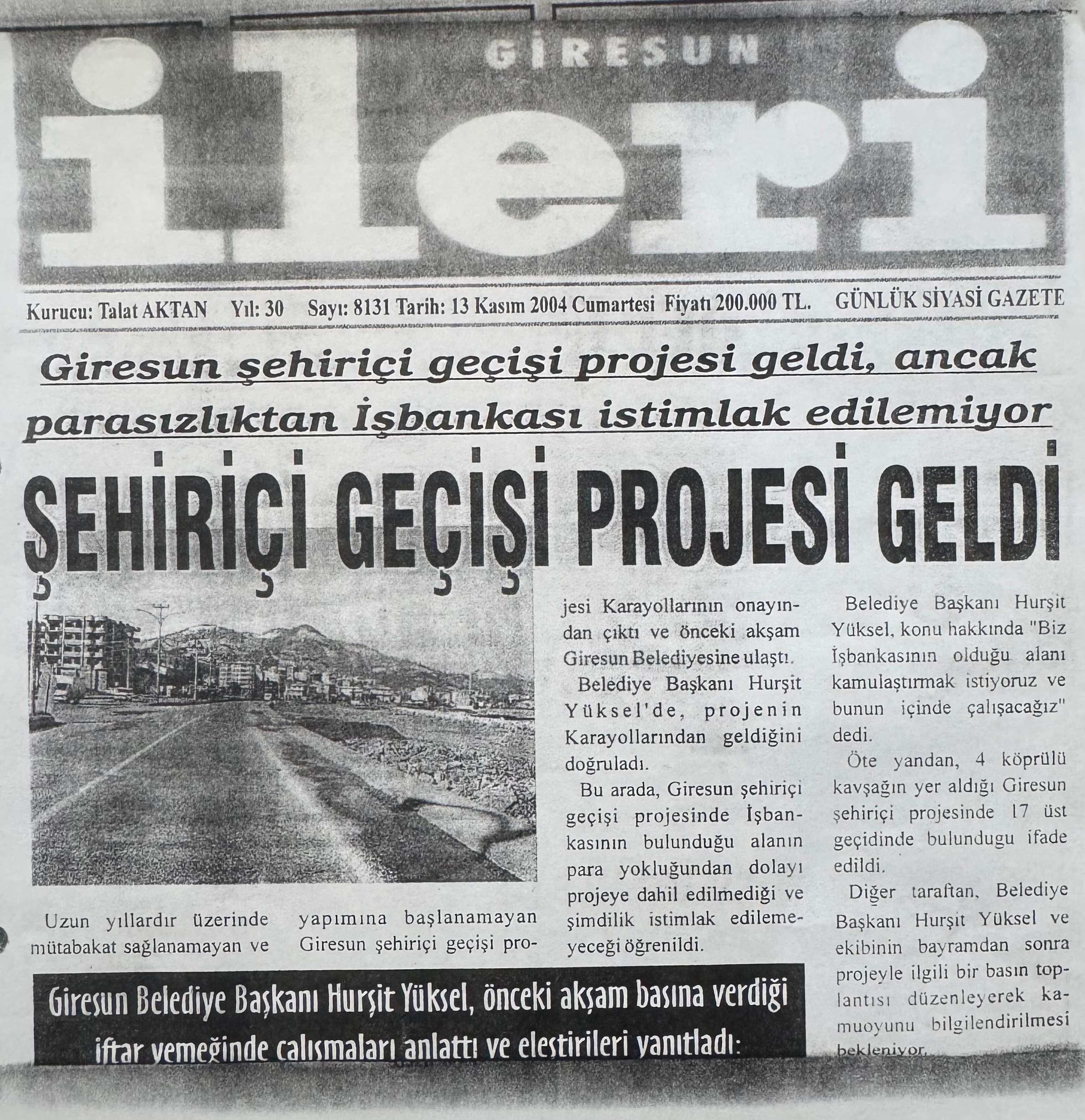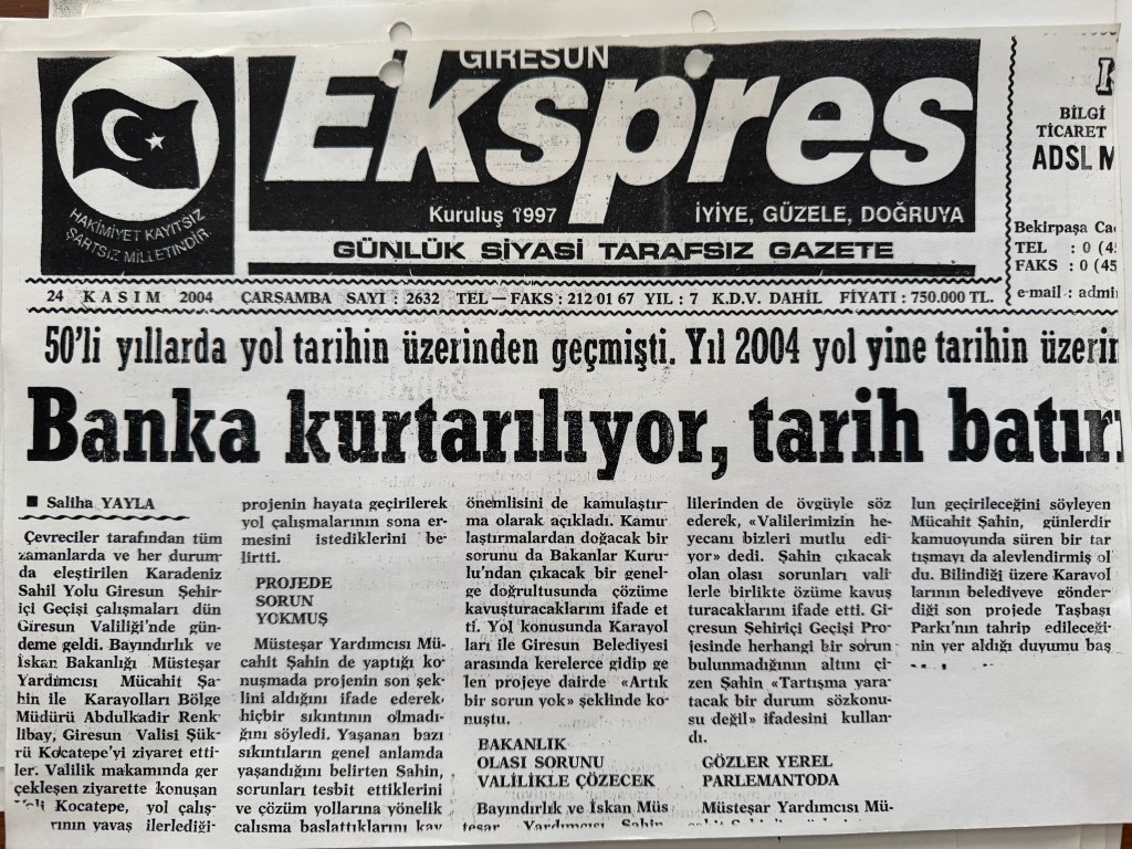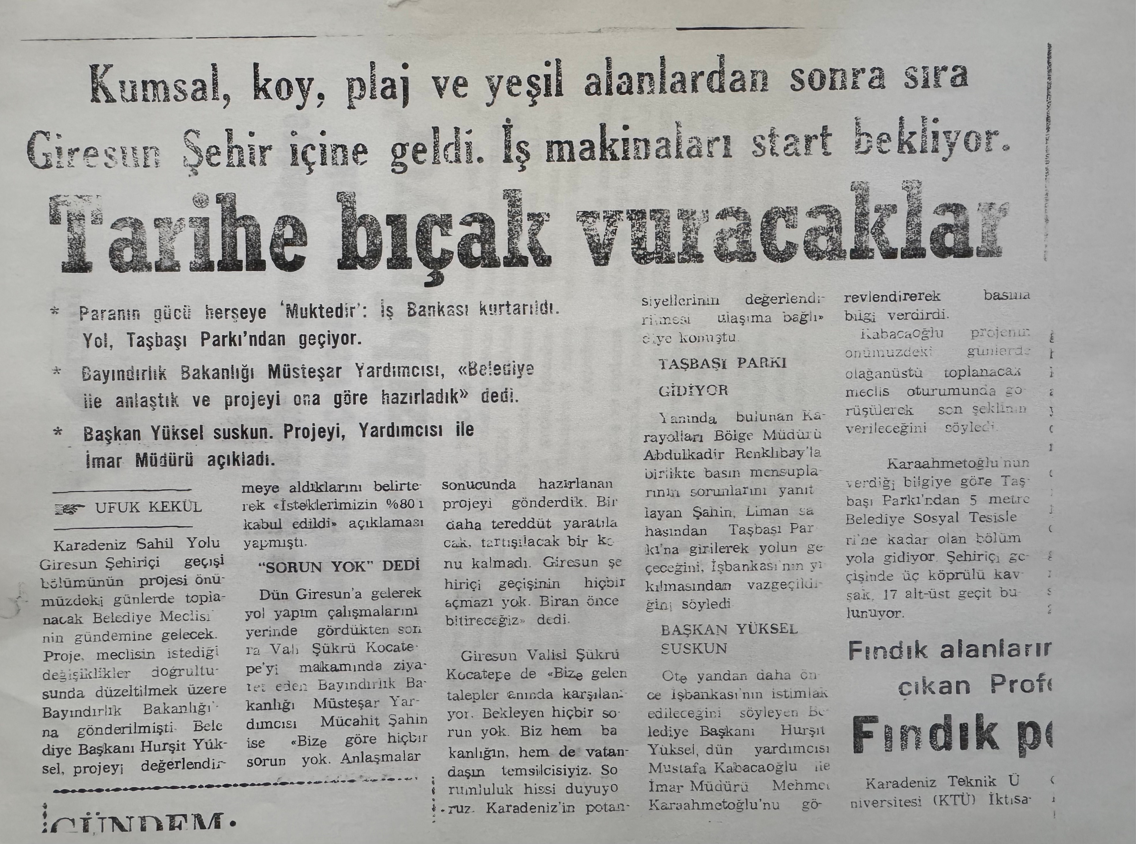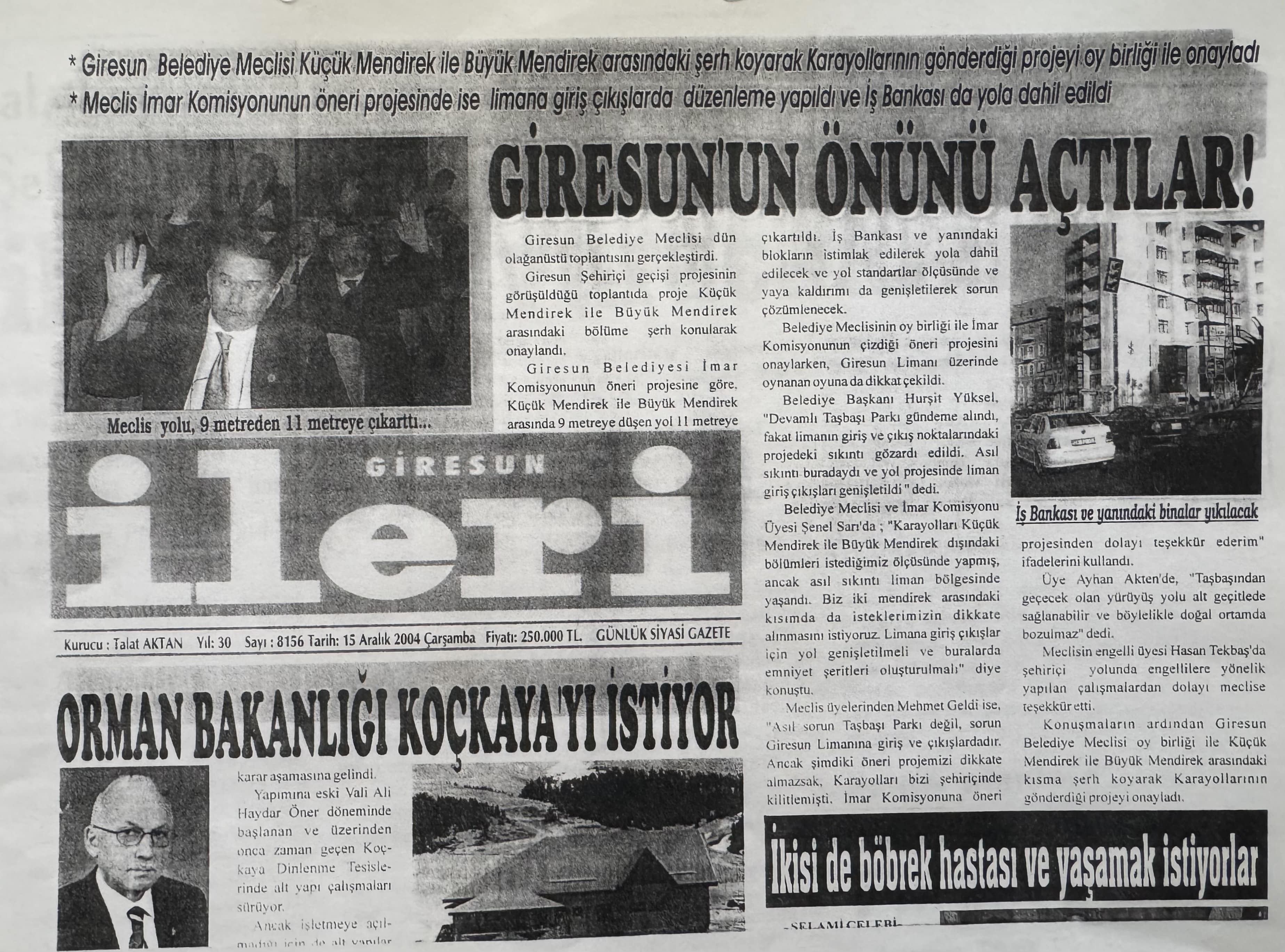 2004 yılıydı. “Karadeniz sahil yolu iyileştirme projesi” “Karadeniz Duble Yolu”na yeni dönüştürülmüştü. Yol inşaatına karşı doğal alanlardaki mücadelemizin sonlarına gelmekteydik. Bazı koyları ve kumsalları kurtarmıştık. Ama bir çok koyu ve kumsalı da kurtaramamıştık. Yol inşaatı Giresun şehir içine yaklaştıkça artık Giresun halkı da mücadelemize daha çok kulak vermeye başlamıştı. Aynı zamanda yolun şehir içi geçişi sırasında yeni bir tehdit doğmuştu. Taşbaşı Parkı’nın neredeyse yarısı yola gitmek üzereydi. Giresun merkezden geçerken sıkışan yolu rahatlatmak için Taşbaşı Parkı ve limandan arazi alınması planlanmıştı. Parkta yıkım işaretlemeleri yapılmıştı. Dönemin Giresun Valisini ziyaret eden Bayındırlık ve İskan Bakanlığı Müsteşar Yardımcısı ile Karayolları 10. Bölge Müdürü Abdülkadir Renklibay, “projenin şehiriçi geçişinde sorun olmadığını, İş Bankasının bulunduğu imar adasının istimlak edilmeyeceğini, yolun limandan ve Taşbaşı Parkı’ndan geçeceğini” bildirmişti. Kendisine “Giresun Belediyesi bu durumu kabul etmez” dendiğinde ise “bu konuda sorun olmaz demişti. Sonuçta kurumların hepsi AK Partili yöneticiler tarafından yönetiliyordu.
