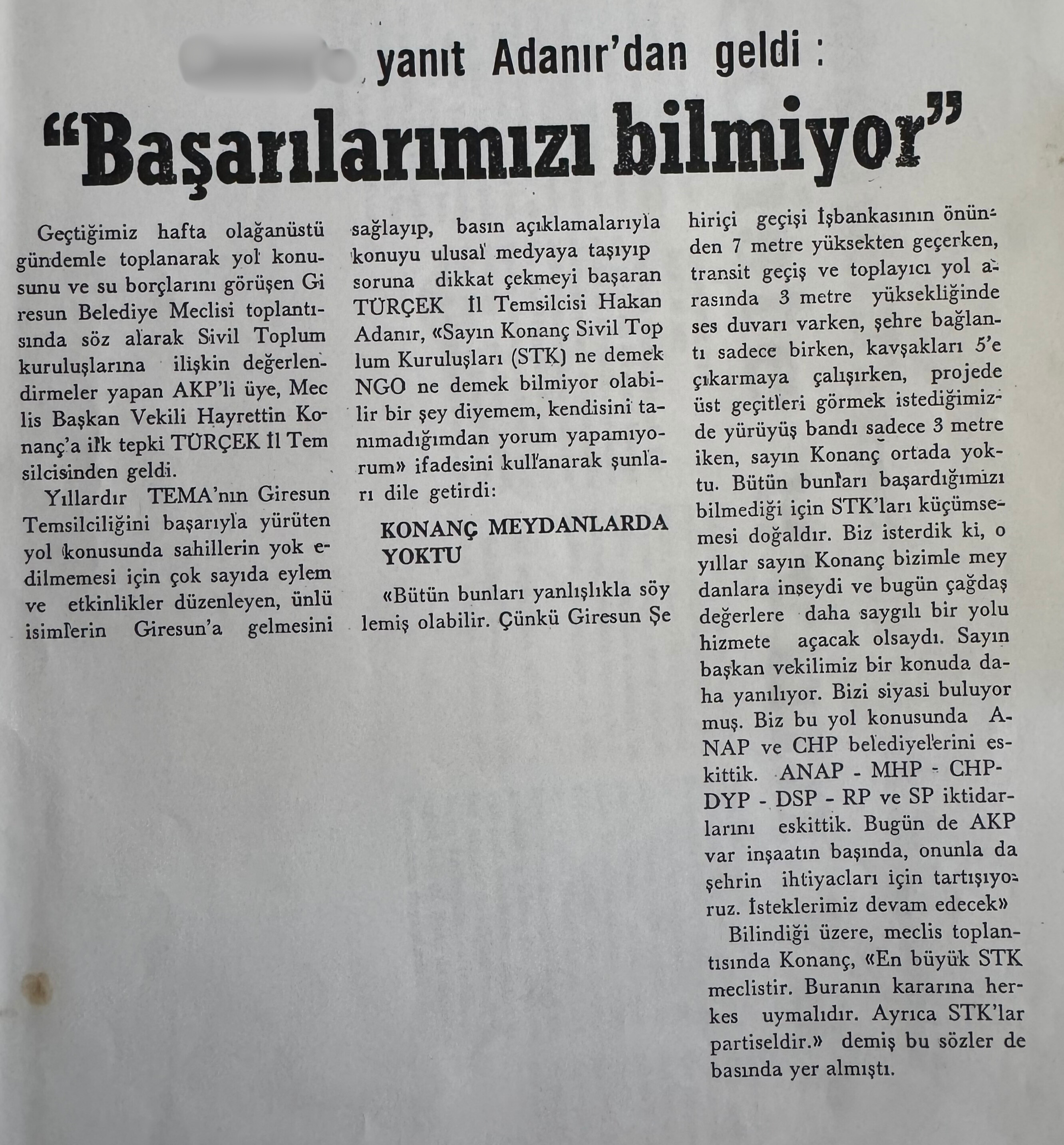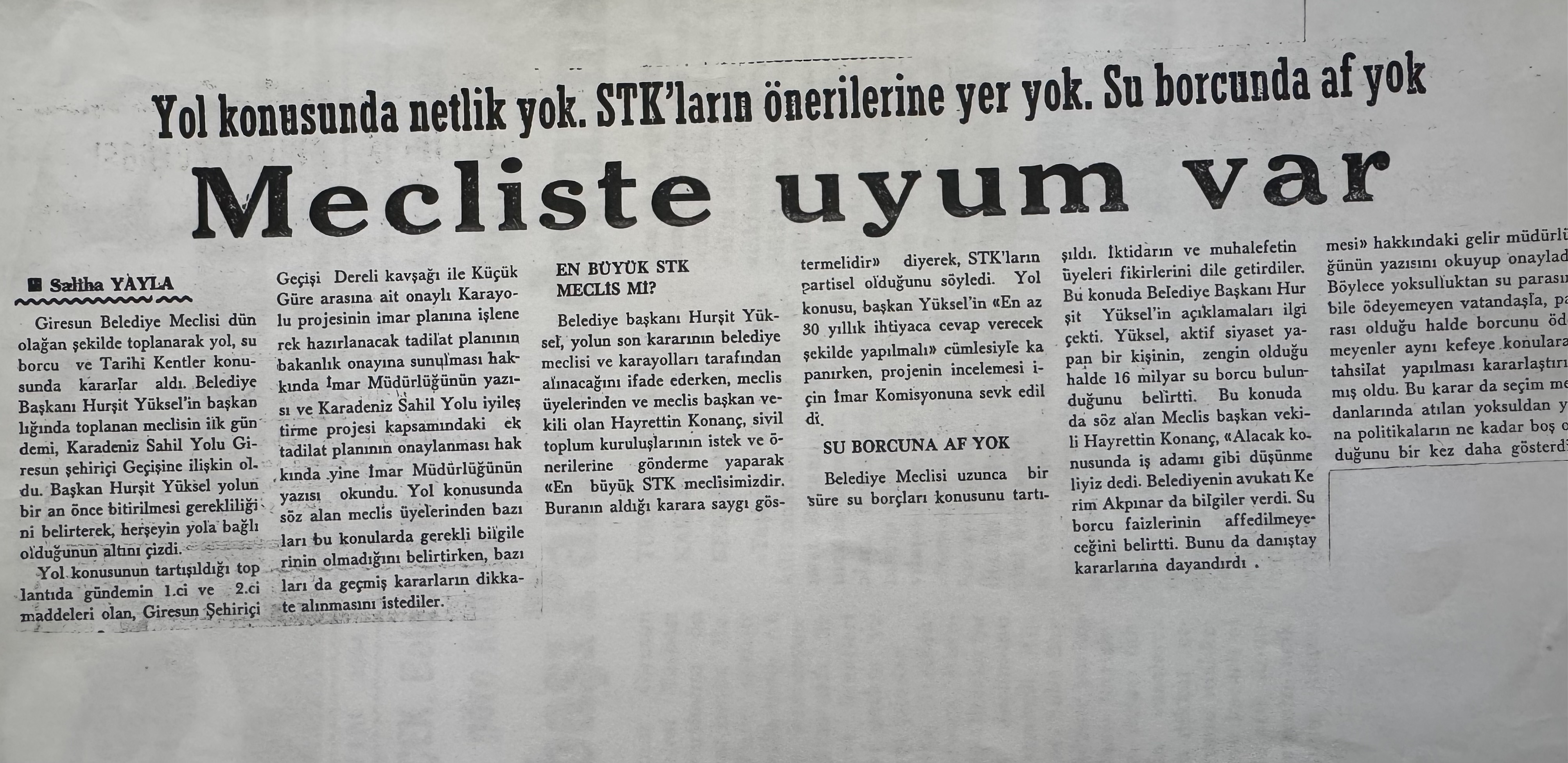 Açıklamamıza cevap Giresun Belediyesi’nde geldi “Belediye Meclisi en büyük sivil toplum örgütüdür” dediler. Yani, halk adına en iyisini biz biliriz, siz kimsiniz dediler. Maalesef bu anlayış bazen günümüzde de geçerli oluyor. Bu karşı çıkış sözü beni oldukça üzmüştü. Cehaletin bu düzeyine karşı sessiz kalınamazdı. Bugün hala var olan bu anlayış yüzünden Giresun’da ve ülkemizde sivil toplum zaten gelişemiyordu. Bu açıklama ile Belediye Meclisi, kendi kararını vereceğini ve şehri dinlemeyeceğini ilan ediyordu.. Haberlerde okuduğunuz gibi dönemin belediye başkanı parkın yıkılmasını istemediğini söylüyordu. Ancak parkı kurtarmak için de bir türlü “meclis” karar alamıyordu.