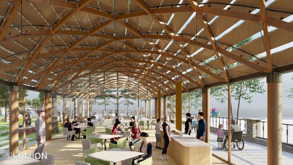 Halkın güneşten ve yağmurdan korunarak çay-kahve içebileceği mekanı tamamen doğal malzemelerden planlamıştı. Ahşap, çelik ve cam malzeme kullanımı parkın doğallığına katkı sağlamıştı.